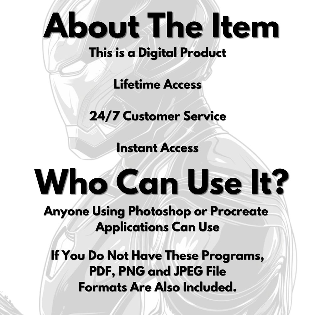 🖥️ Please Note: This is a Digital Product: No physical items will be shipped. Once your purchase is complete, you'll receive instant access to download and start using these brushes, so you can begin crafting your Iron Man-inspired designs immediately!